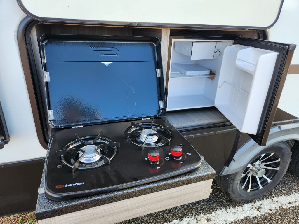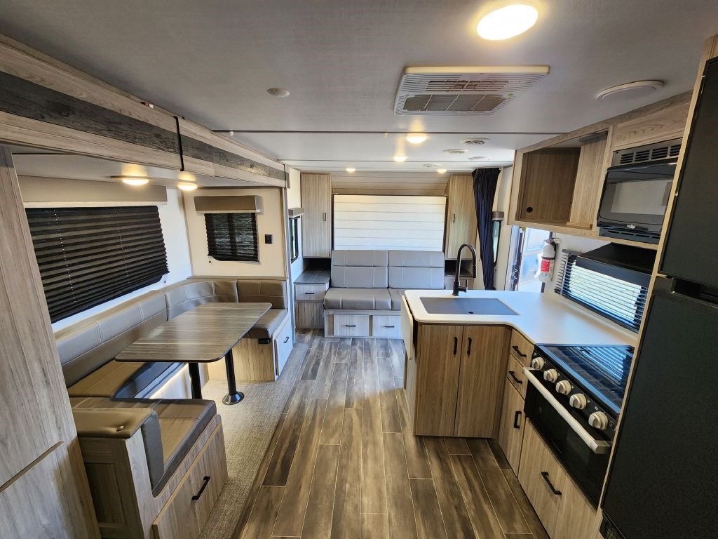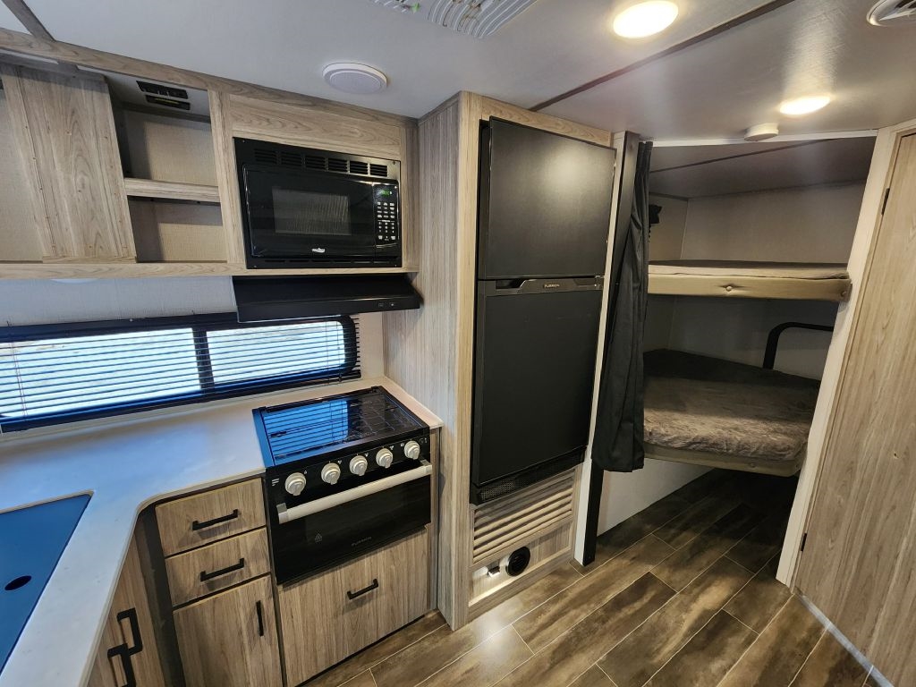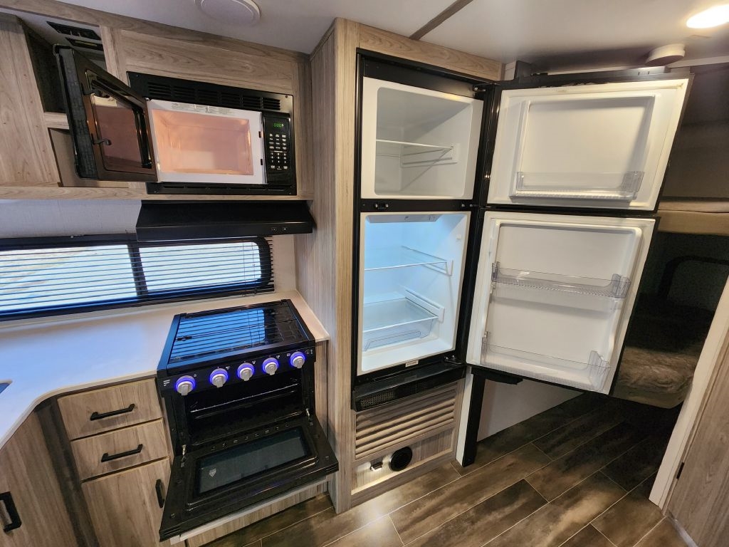 Kitchen: Includes a three-burner range, microwave, 12V refrigerator, and a 6-gallon water heater.