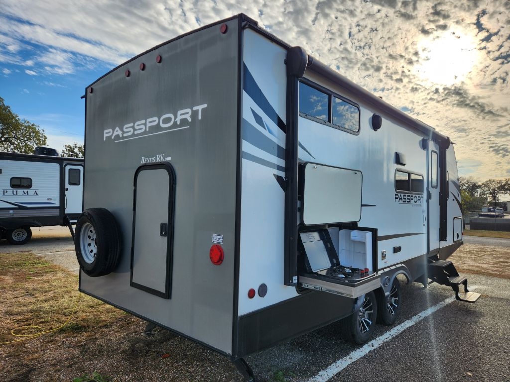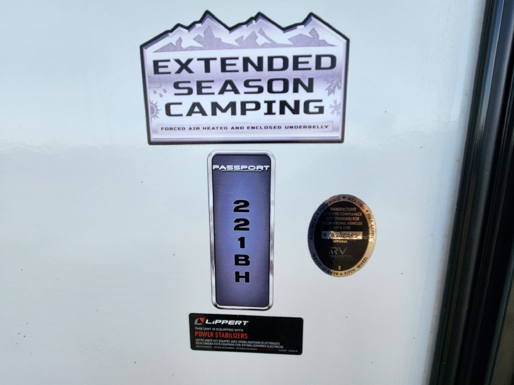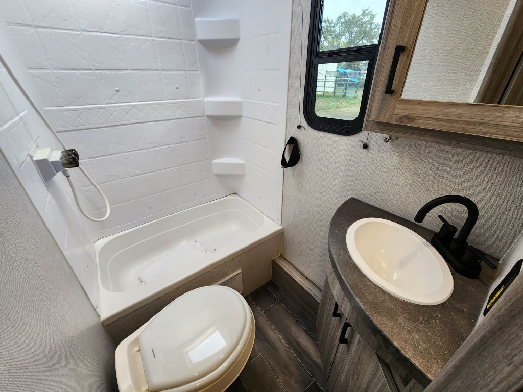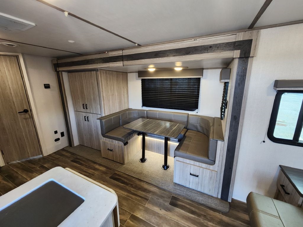 Kitchen: Includes a three-burner range, microwave, 12V refrigerator, and a 6-gallon water heater.