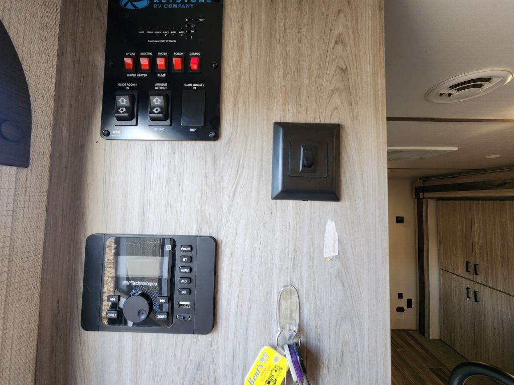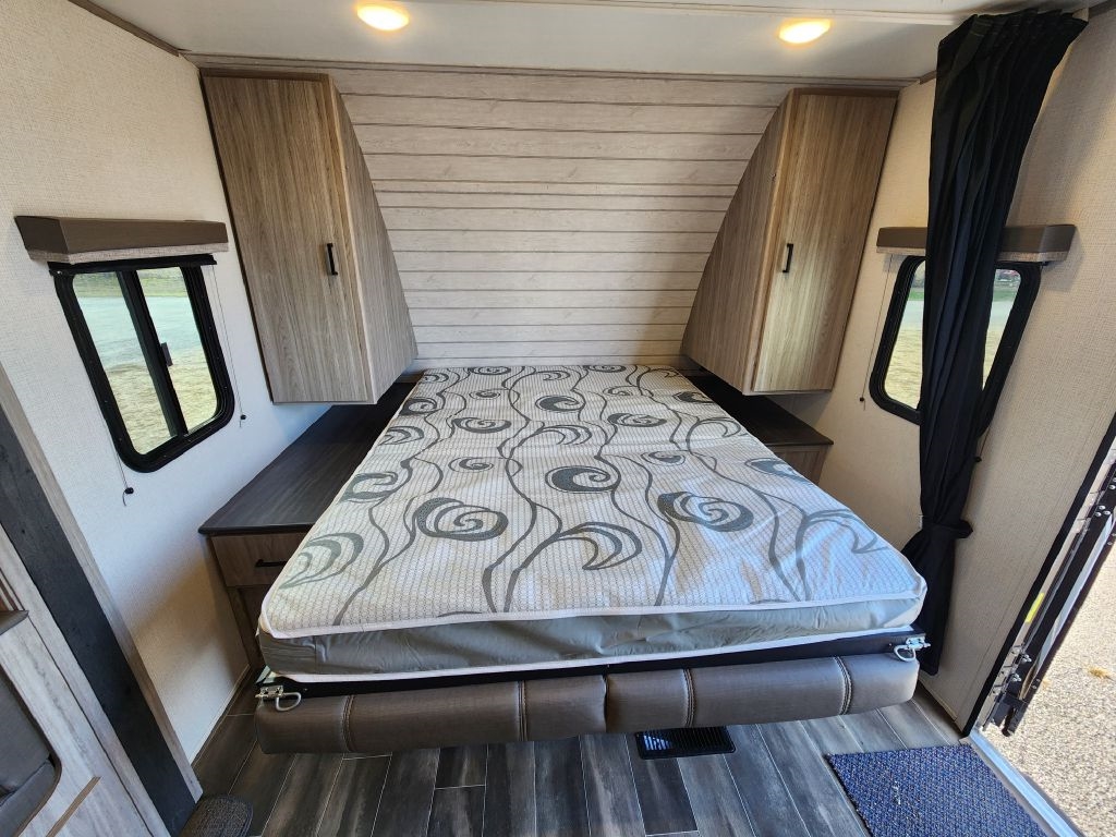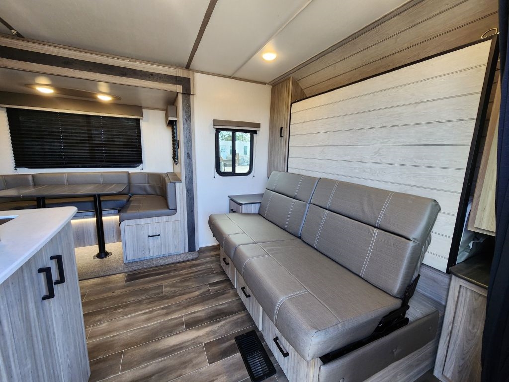 Bedroom: The front of the RV includes a Murphy bed with a couch.