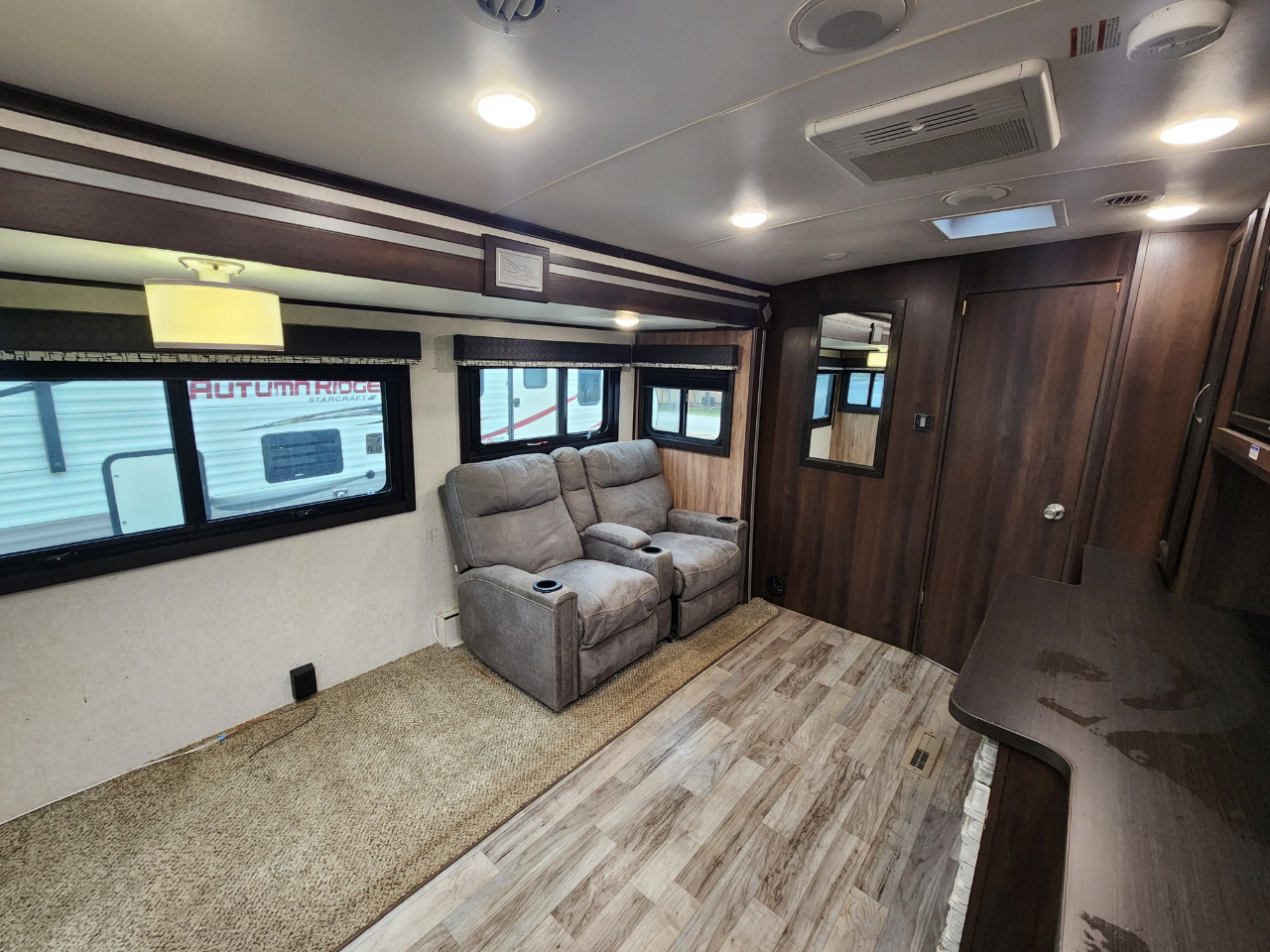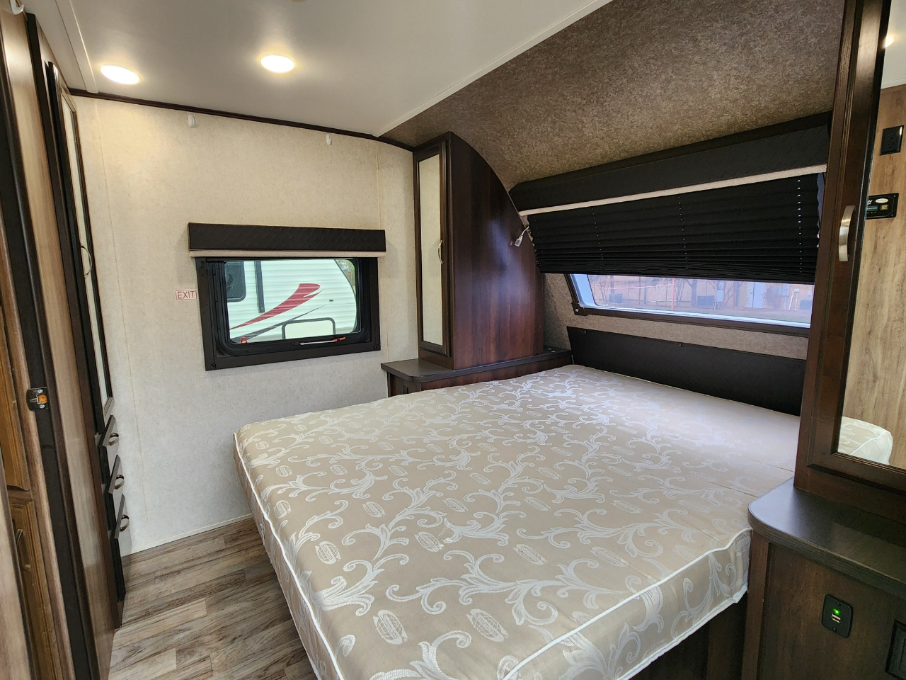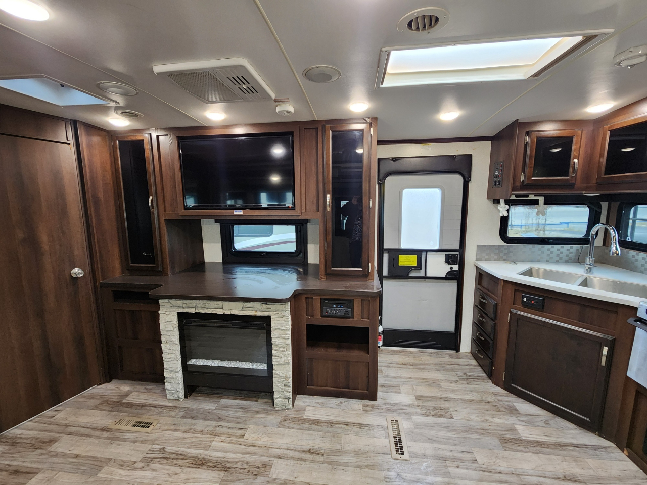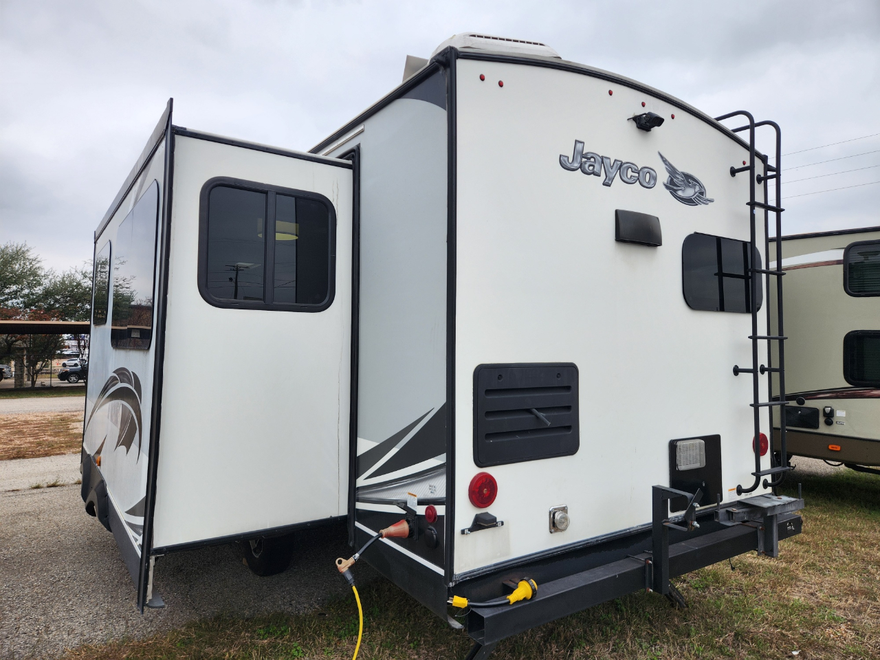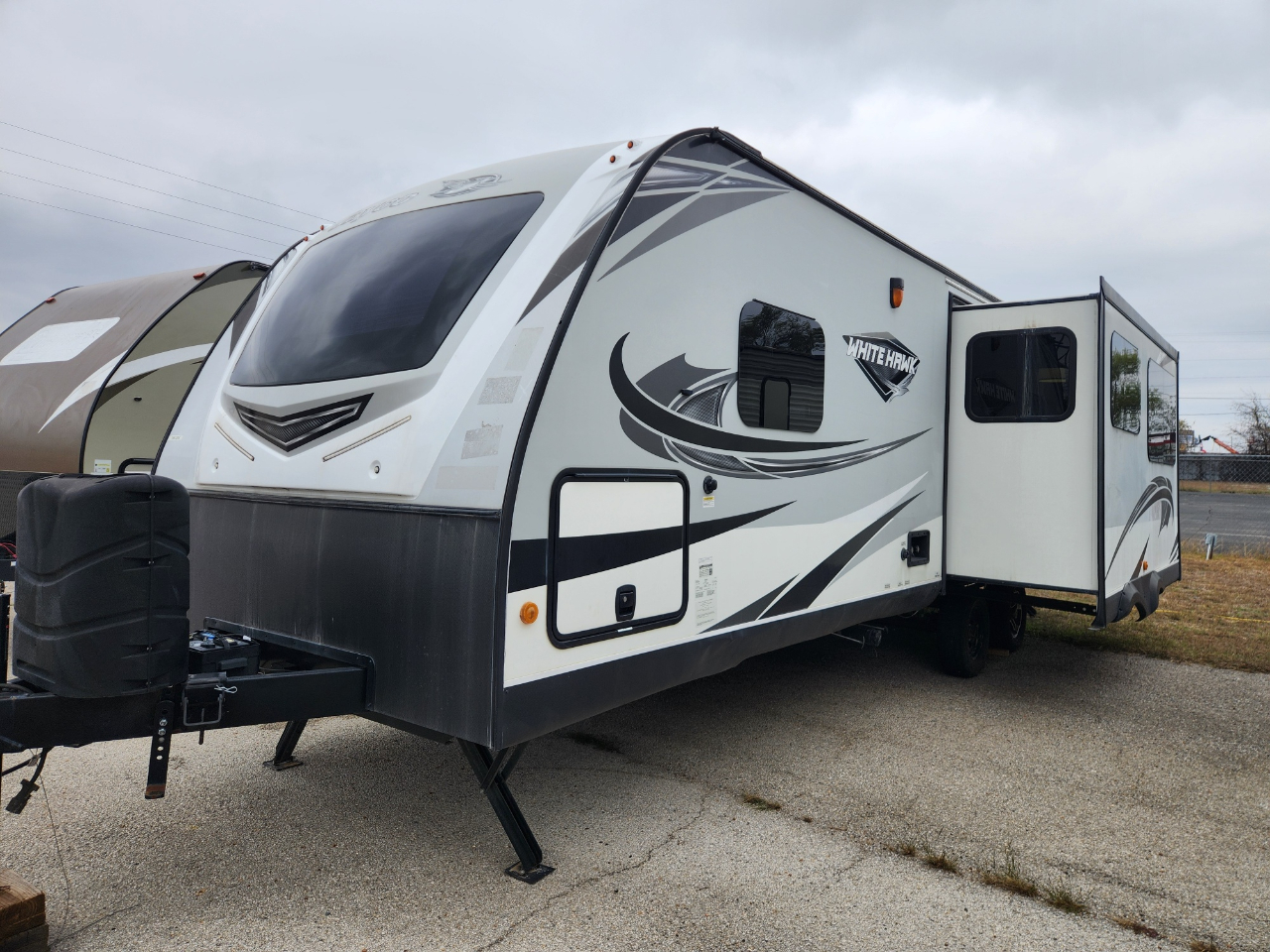 Convenience: Comes with a powered awning with LED lights and an exterior TV bracket.