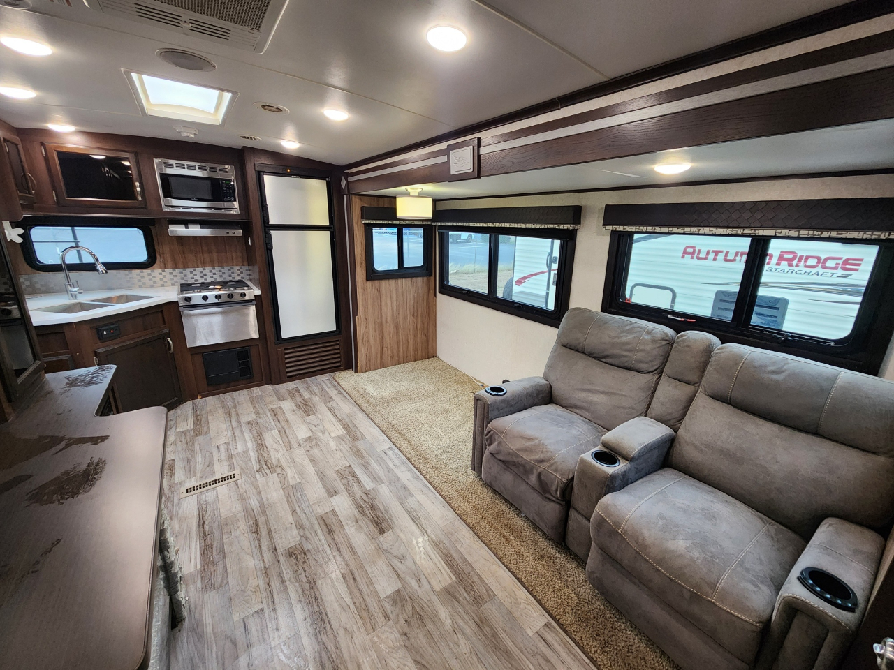 Interior: Includes modern interior design options, LED lighting, a 34-inch radius shower, and optional features like a fireplace and reclining sofa.